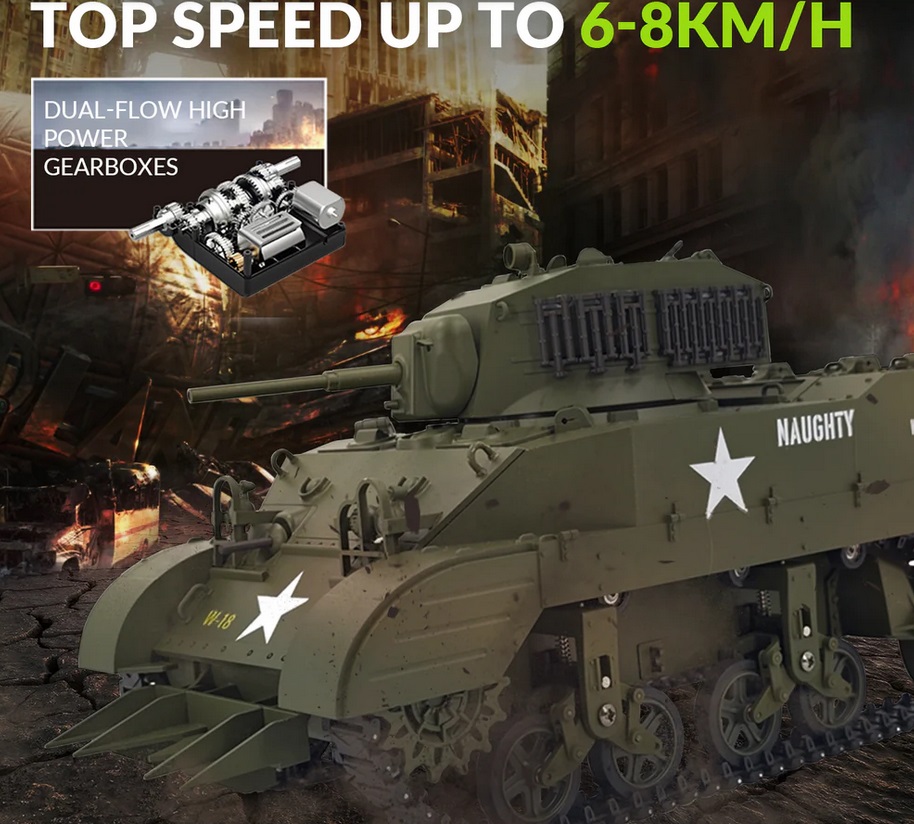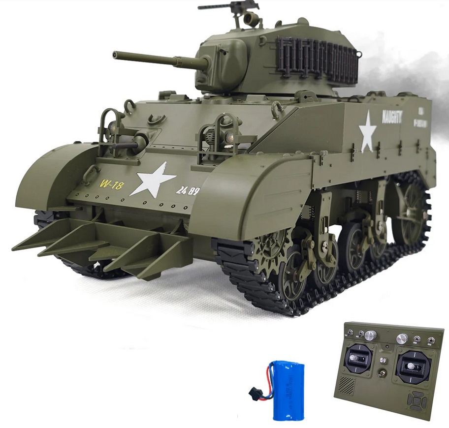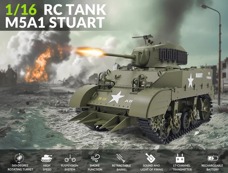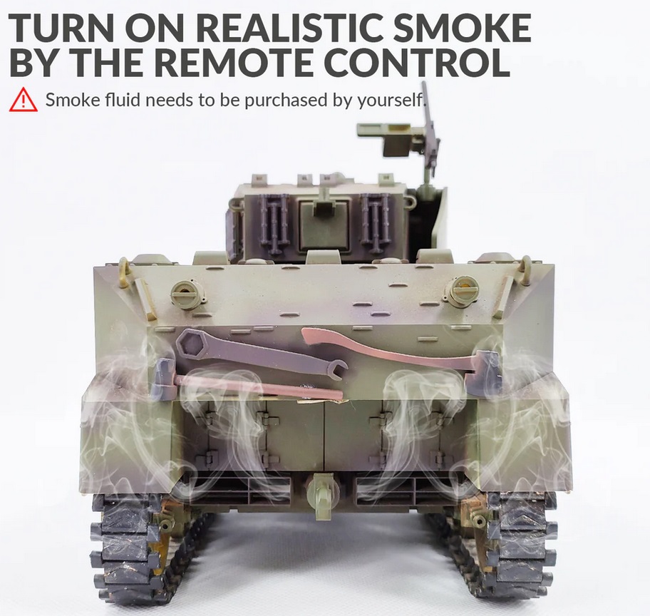 [RC Model with A Lot of Detail] The remote control tank has the same suspension system as the M5A1 Stuart. All load-bearing wheels are independently suspended, which allows it to go through complex terrain easily. It also can make effects and engine sounds and has controllable lights. What's more, you can control it to release smoke while moving. Note: Smoke fluid needs to be purchased by yourself.