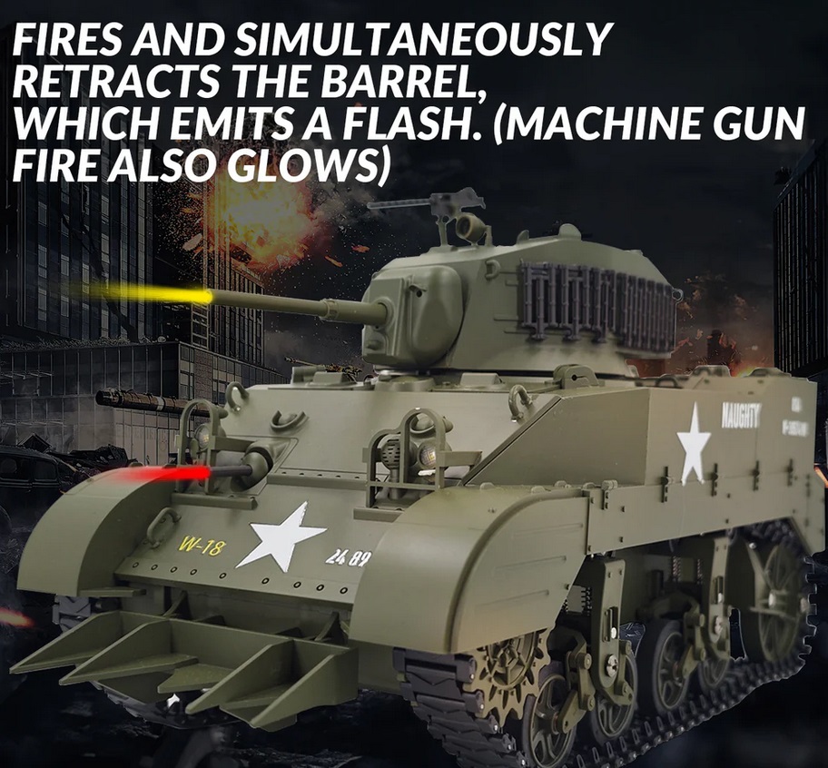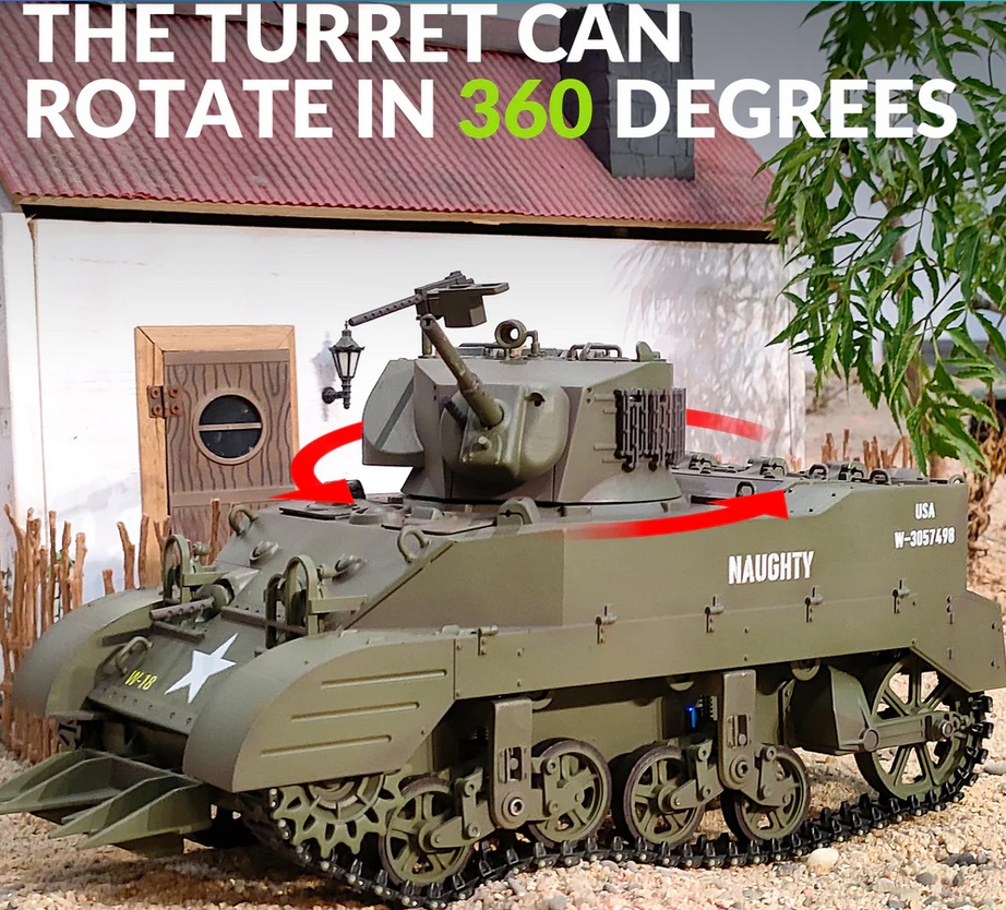 [Highly Simulated M5A1 Stuart RC Tank] The turret servo of the model toy can rotate 360 degrees with electric slip ring. The gun barrel servo can raise and lower 30 degrees. In addition, it will retract the barrel and flash when it fires. The machine gun also glows when it fires.