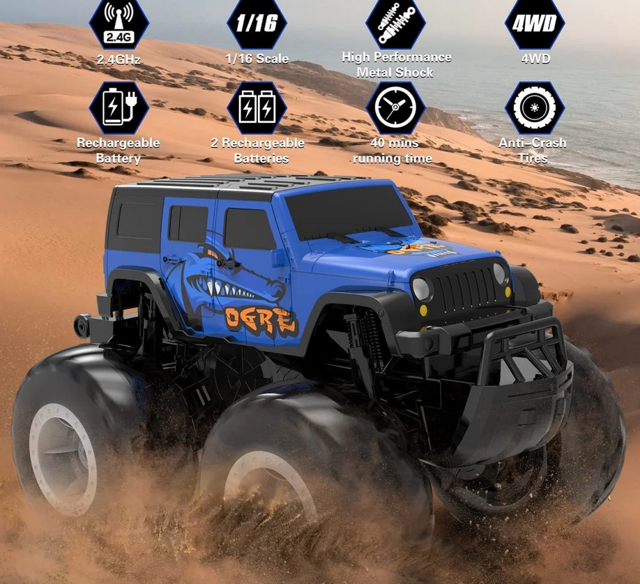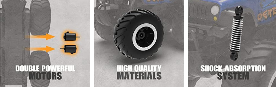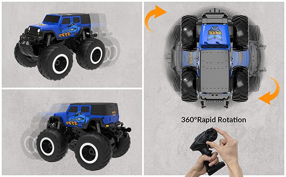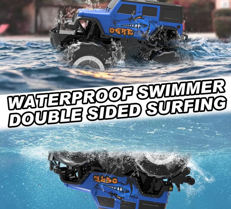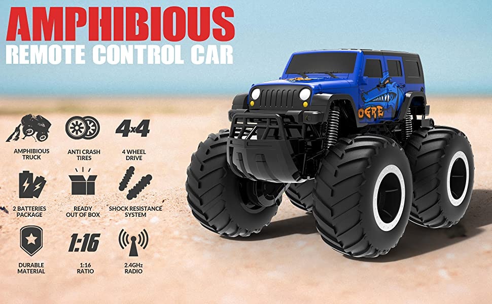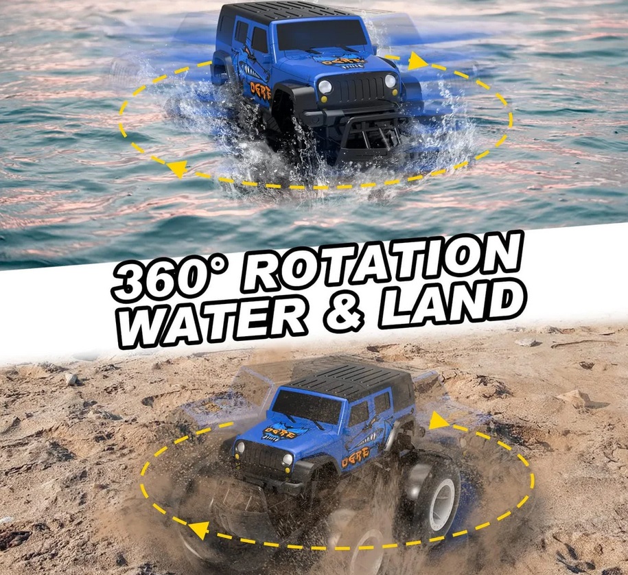 【Amazing Amphibious RC CAR for All Terrain】- This amphibious remote control car can do double-sided running, front & back flips, 360 degree spins on the water and ground. The 4wd off-road design supports this RC cars to easily break through the land, sand, muddy, grass, snow and beach! Not only be a all terrain rc monster truck, also be a cool remote control boat for pool and lake toys, to surf it in river, pond or other water surface.
